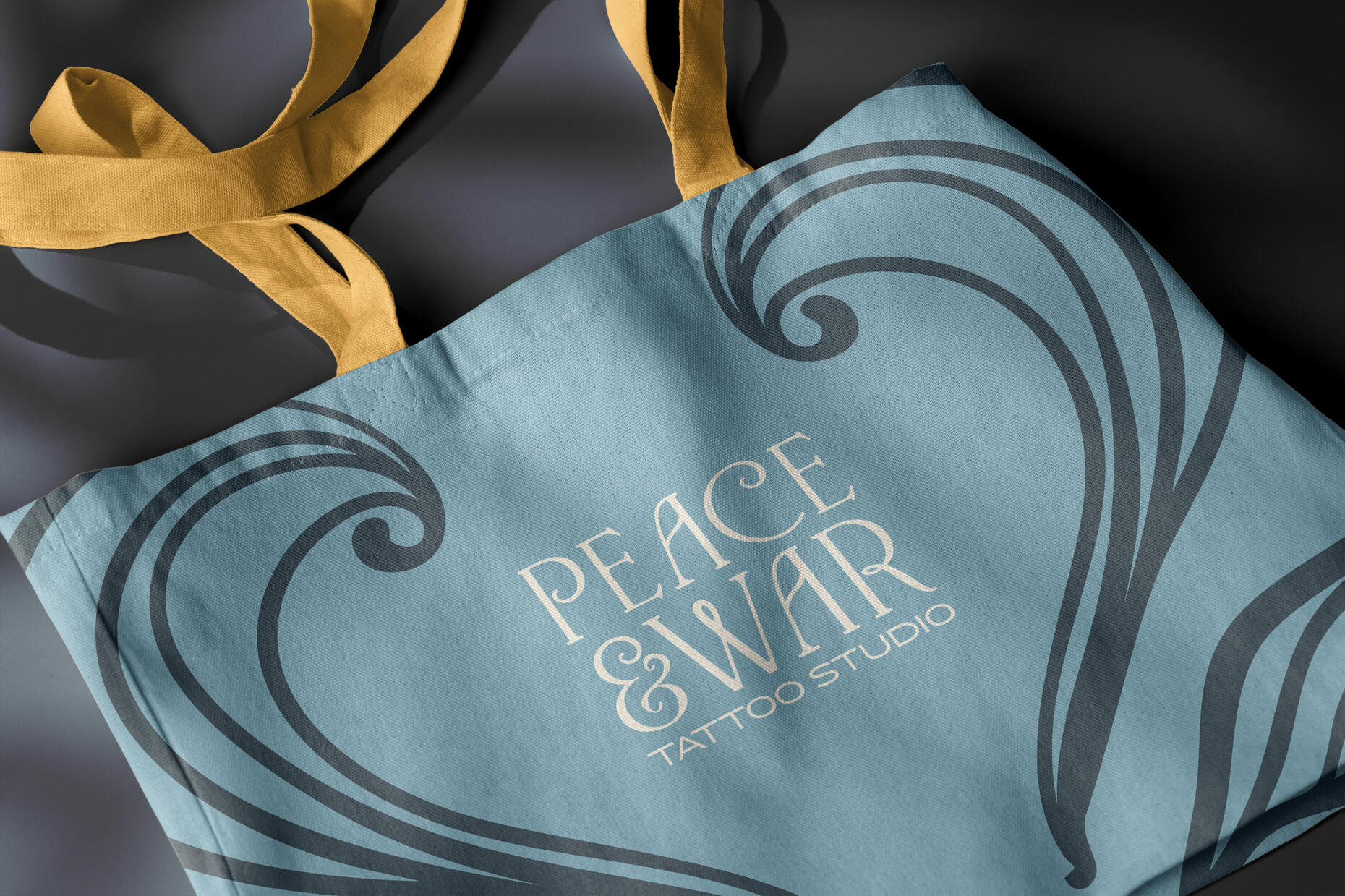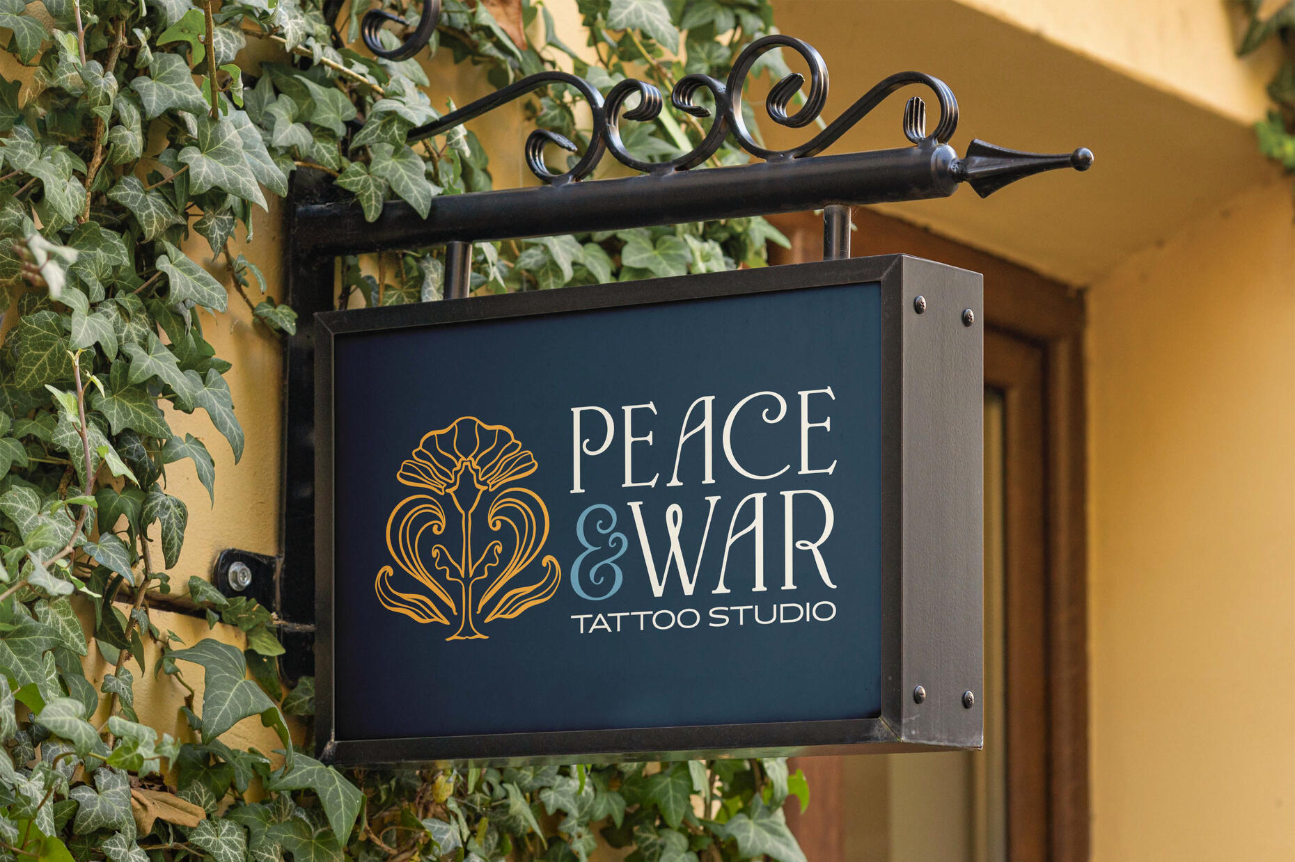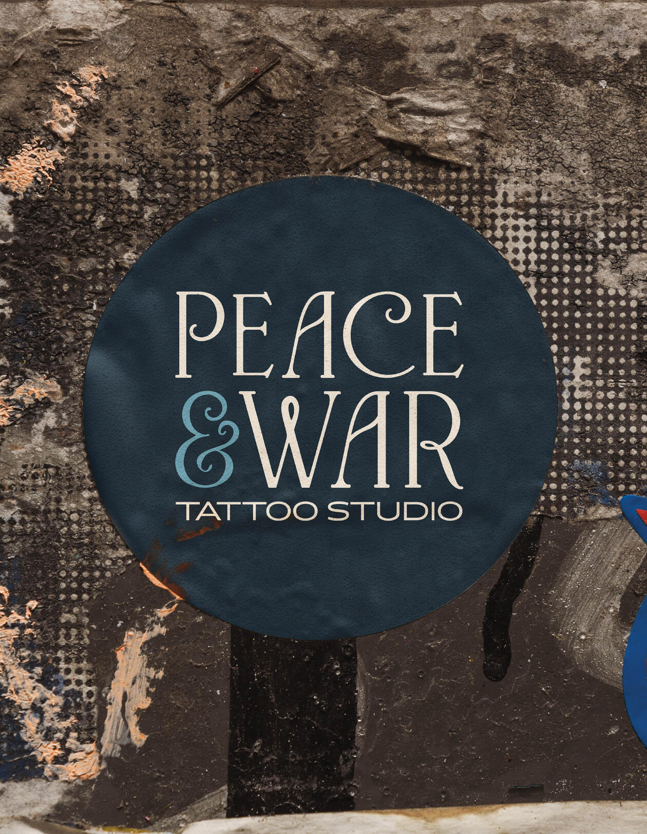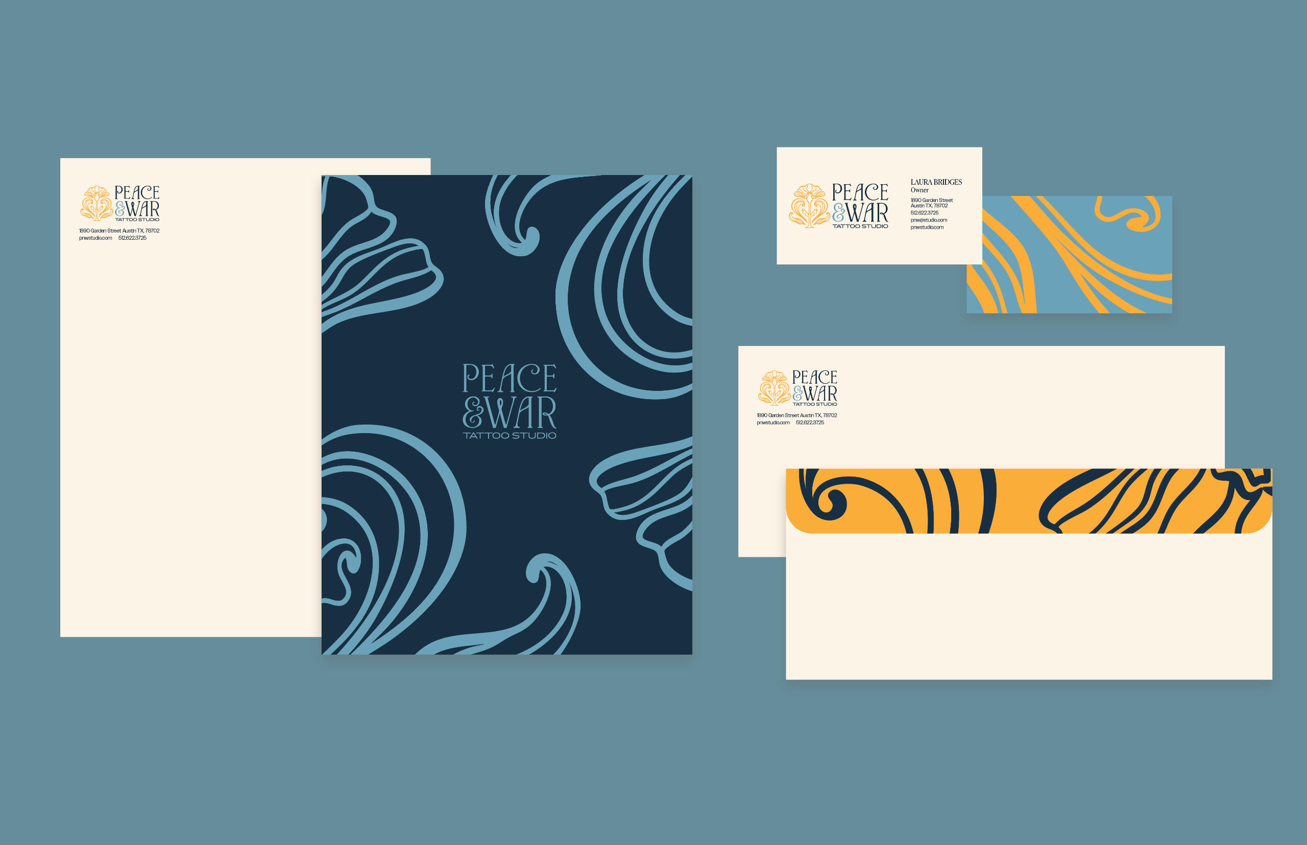 Peace&War Tattoo Studio is located in Austin,TX. The elements of the brand are inspired by the revival of the art nouveau of the 60s. The concept was to introduce a more feminine aspect to a more stereotypical masculine institution. The colors of blues, yellow, and cream help create a delicate look.