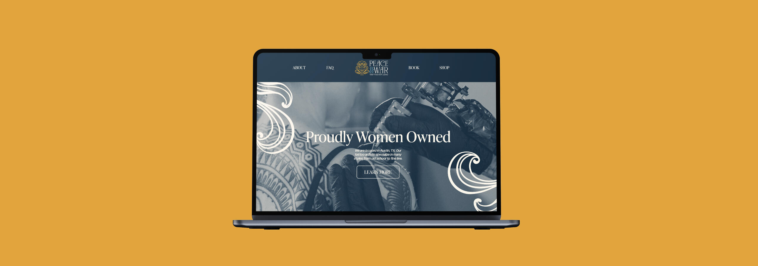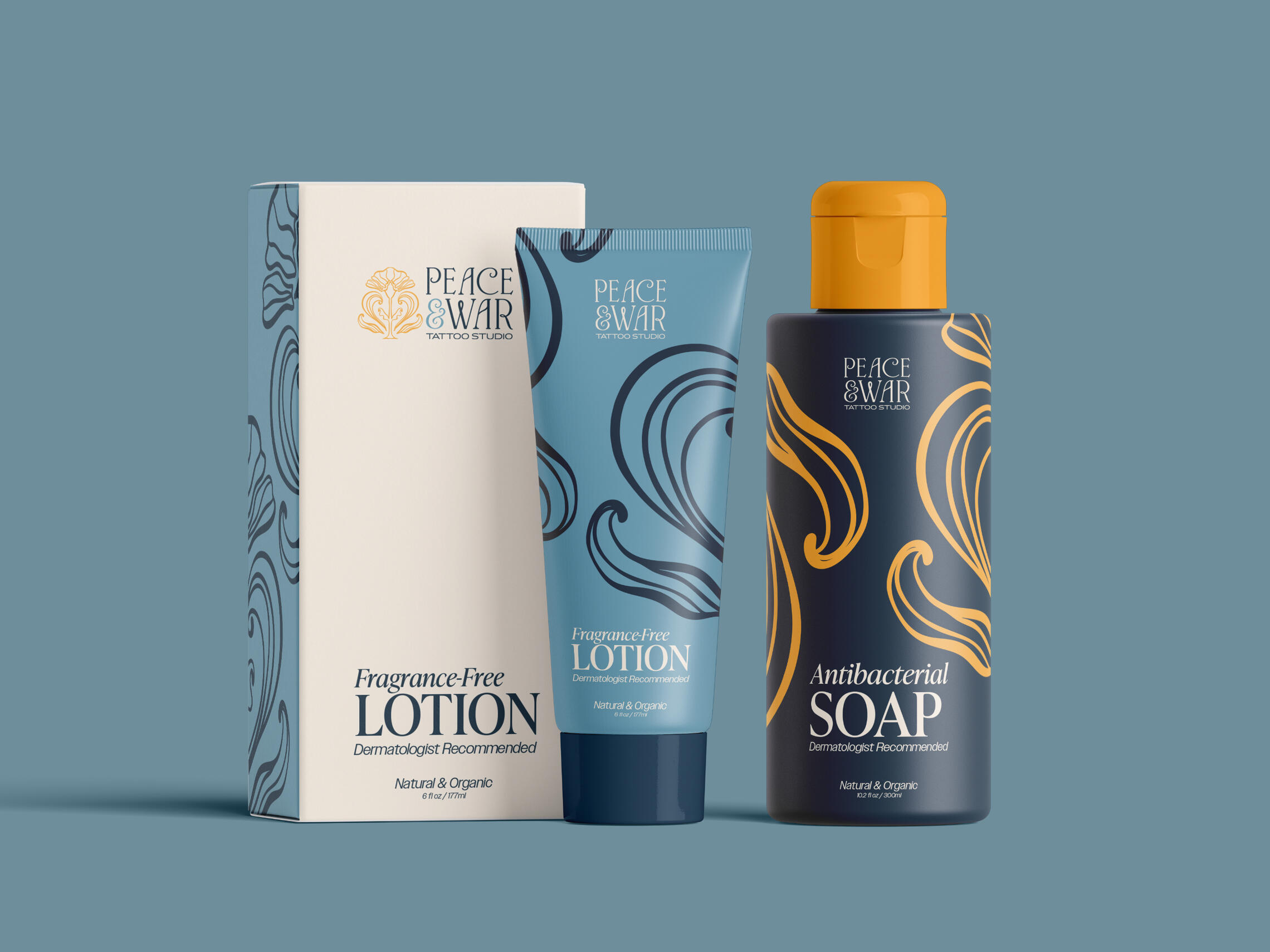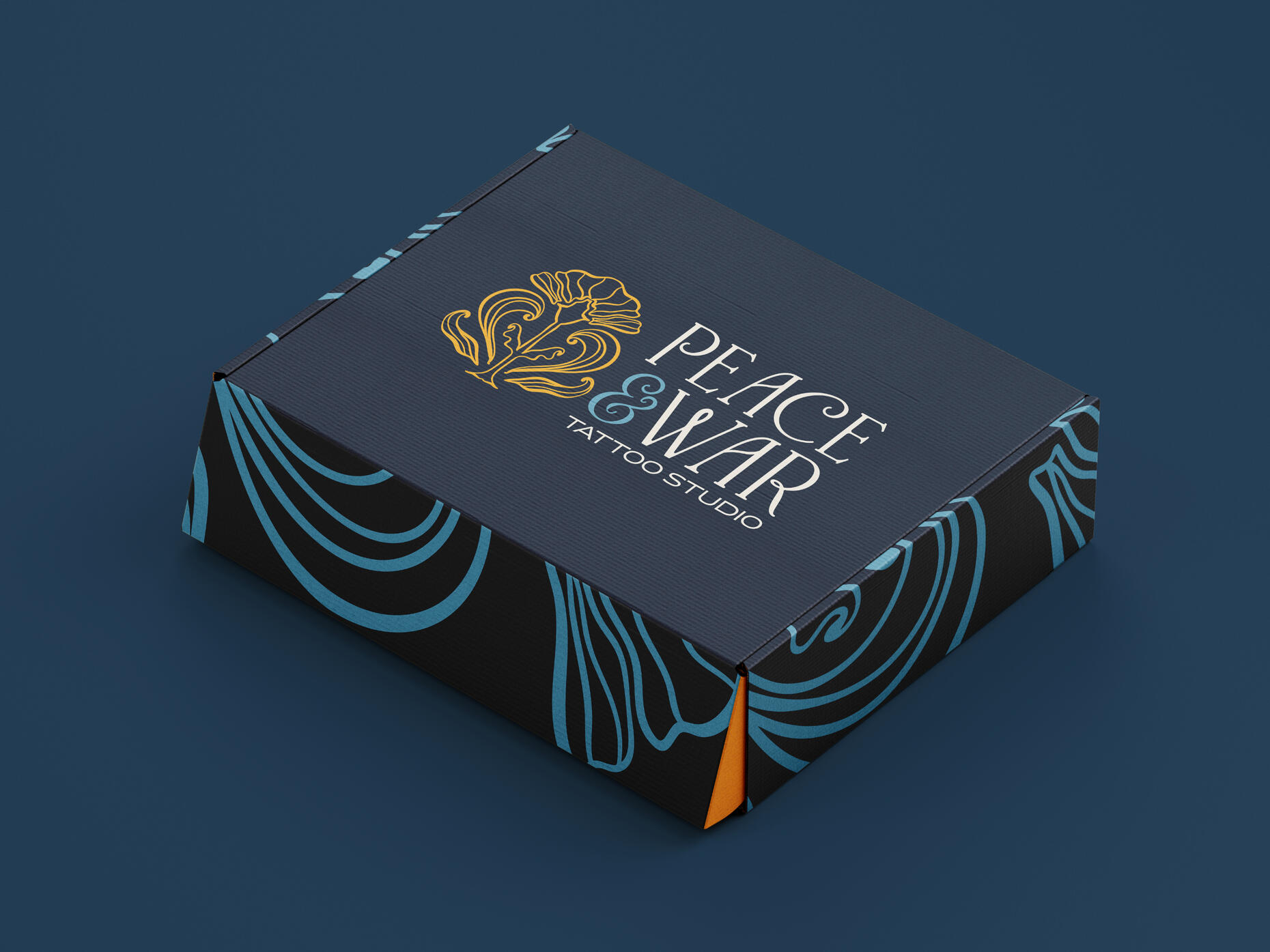 Peace&War Tattoo Studio is located in Austin,TX. The elements of the brand are inspired by the revival of the art nouveau of the 60s. The concept was to introduce a more feminine aspect to a more stereotypical masculine institution. The colors of blues, yellow, and cream help create a delicate look.