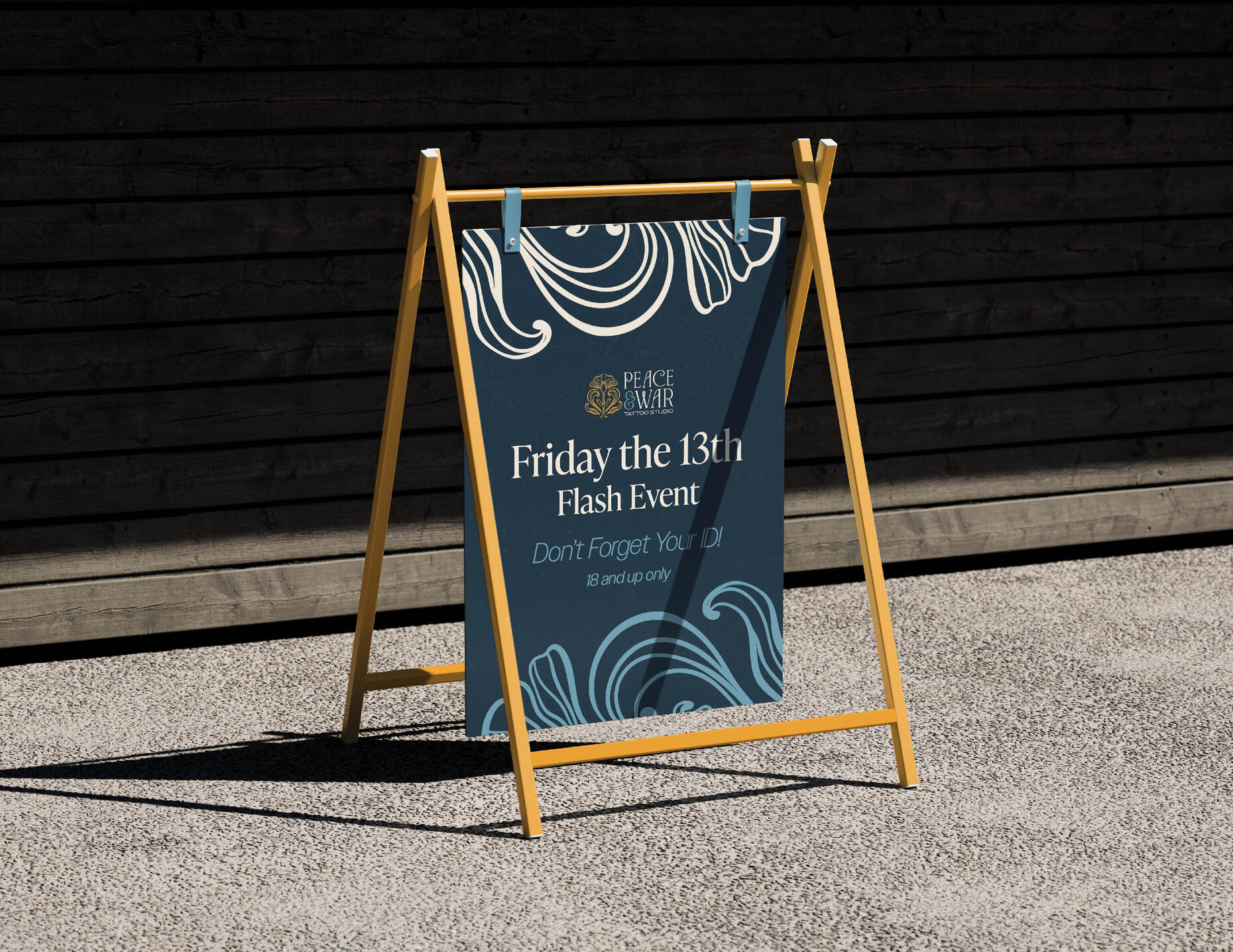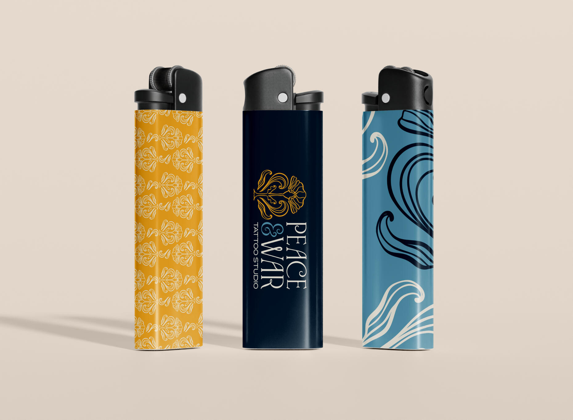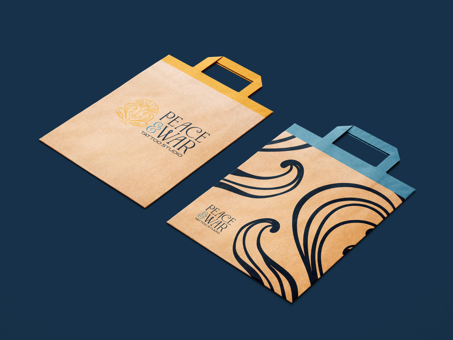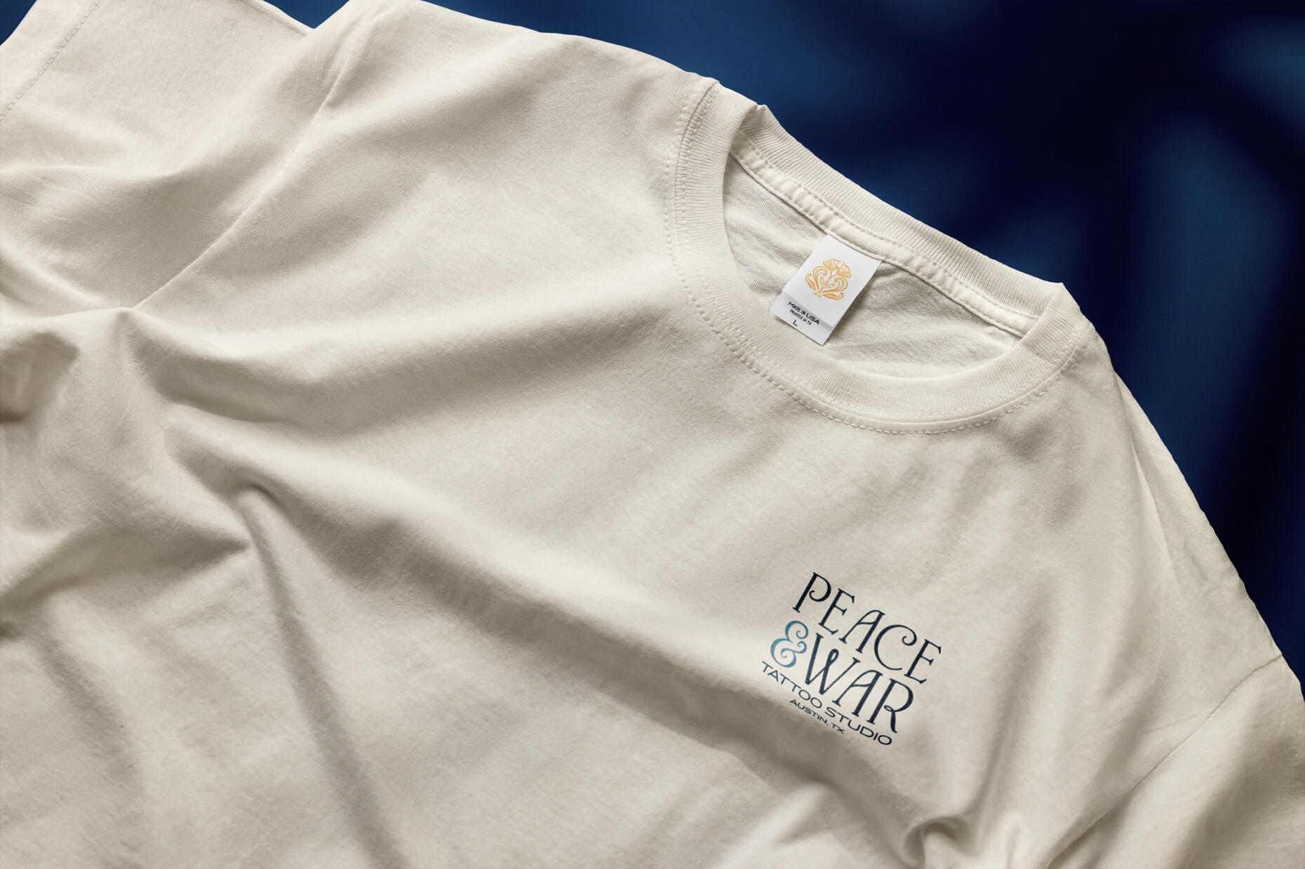 Peace&War Tattoo Studio is located in Austin,TX. The elements of the brand are inspired by the revival of the art nouveau of the 60s. The concept was to introduce a more feminine aspect to a more stereotypical masculine institution. The colors of blues, yellow, and cream help create a delicate look.