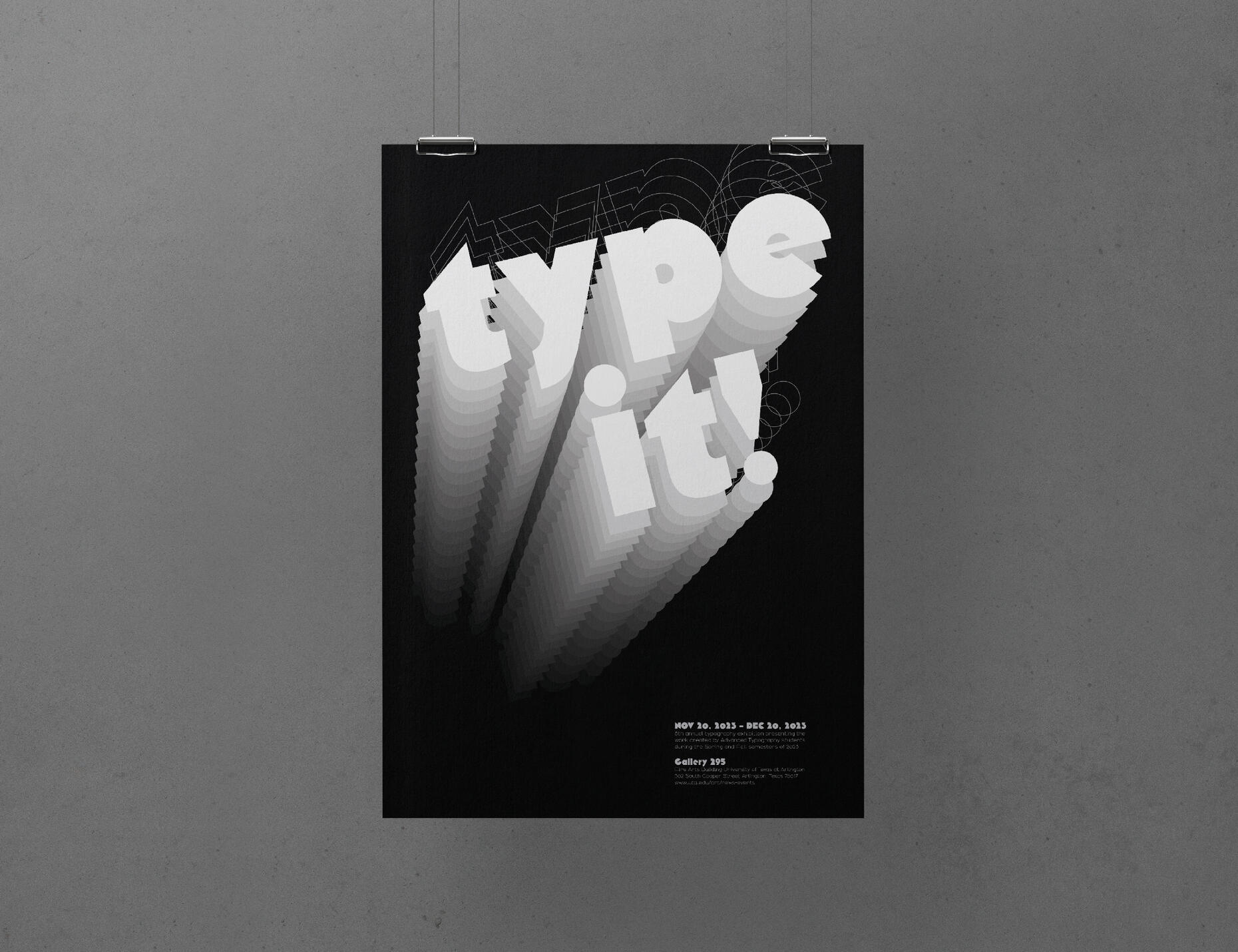 Type It! is a exhibition identity project which included a poster and ephemera. The poster allowed type to be the main focus. Since repetition is a major element is was key to use negative space in order to let the type breathe. The black and white color palette also helps create a minimal look which furthermore allows the type to be the center focus of the poster and deliverables.