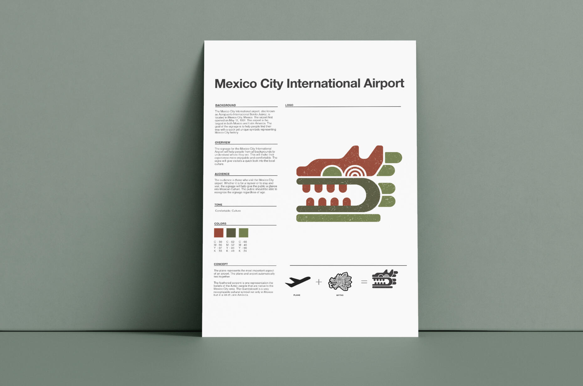 This project consisted of creating a logo and way finding system for an already existing place. The key elements for the airport was to represent the culture of its location. The Quetzalcoatl which represents the culture along with a place were combines to create the logo. The muted red and greens are also something that is typically seen in Mexican culture, such as the flag. Aztec art also heavily inspired the half circle element.