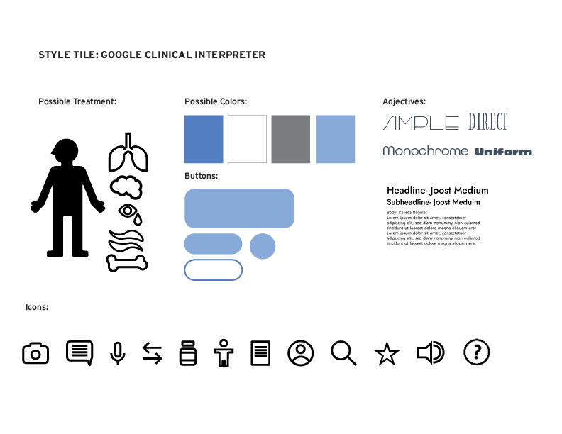 Google Clinical Interpreter is an extension of an existing app. With this project is was key to keep a similar look to the original brand design. The minimal elements and color palette helped interpret the intricate message of the app into a more approachable layout. It was also key to have visual elements such as icons, as it is a universal symbol regardless of what language the user speaks.