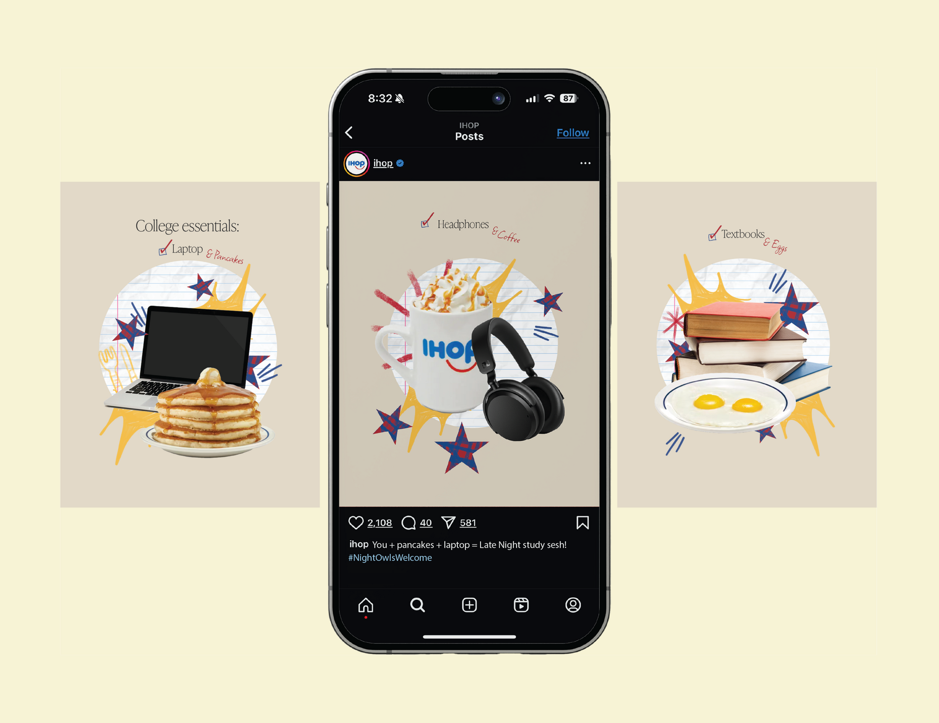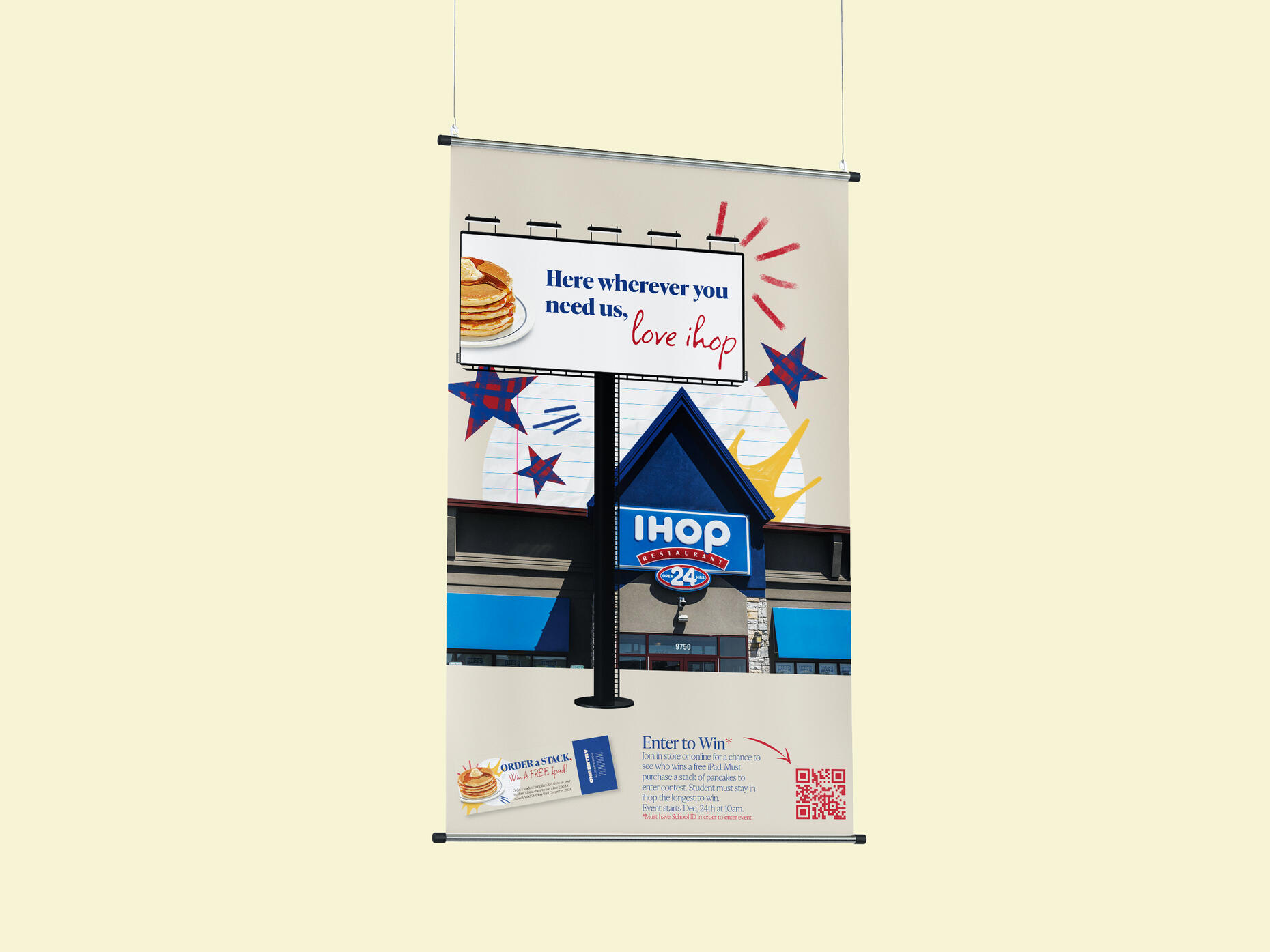 This project consisted of rebranding a well know establishment with something completely different. IHop offers 24/7 service and who could benefit from this the most? College students! Our brightly colored and handmade elements give this establishment a fun and youthful look, for those students looking for a safe place to eat and do their homework